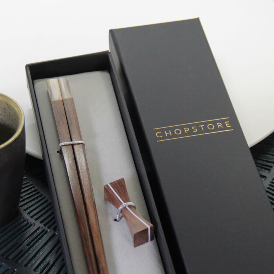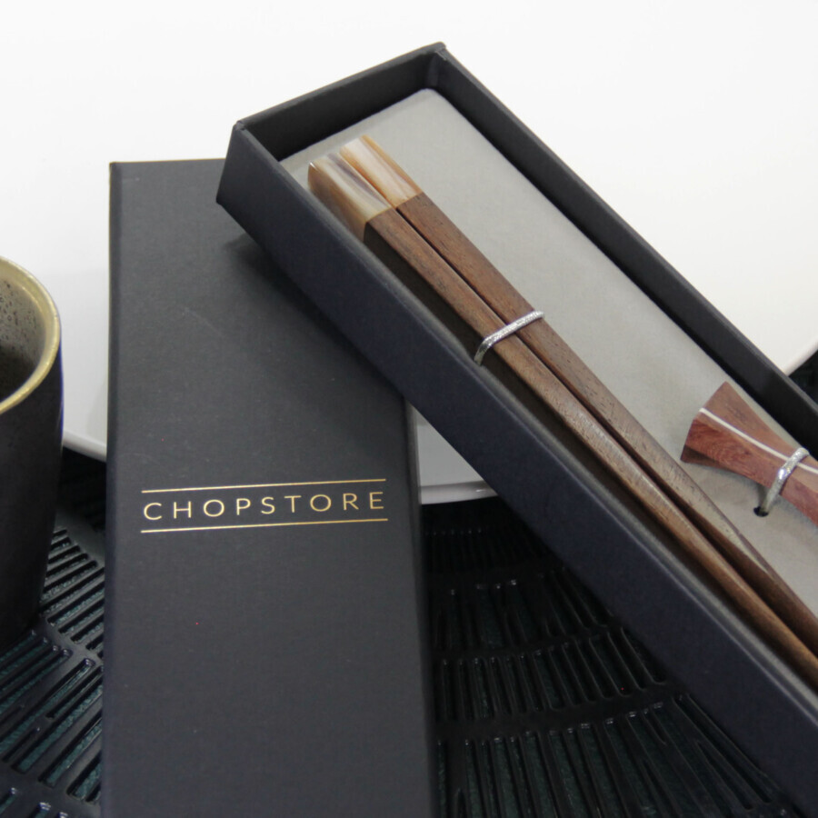 De gift-box is geheel in stijl van de chopsticks vormgegeven. Een stijlvol mat zwarte buitenkant met een zacht-vilten grijze binnenkant waar de chopsticks op gepresenteerd worden.