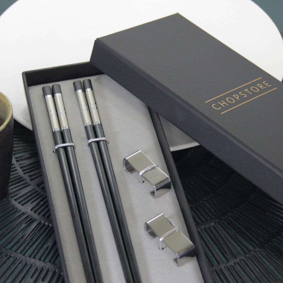 De gift-box is geheel in stijl van de chopsticks vormgegeven. Een stijlvol mat zwarte buitenkant met een zacht-vilten grijze binnenkant waar de chopsticks op gepresenteerd worden.