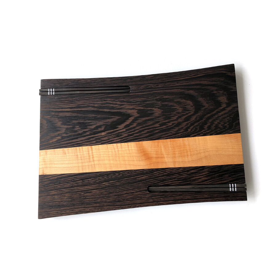 Het type plank "Momiji" heeft de volgende afmetingen: 45cm(L) * 31,5cm(B) * 1,8cm(H). De plank bevat twee op maat gemaakte sleuven om de chopsticks neer te leggen tijdens de tafelschikking. De Gairo Traditional chopsticks? worden meegeleverd. De plank is voornamelijk gemaakt van de houtsoorten wengé en gevlamde esdoorn.