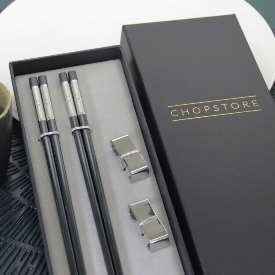 De gift-box is geheel in stijl van de chopsticks vormgegeven. Een stijlvol mat zwarte buitenkant met een zacht-vilten grijze binnenkant waar de chopsticks op gepresenteerd worden.